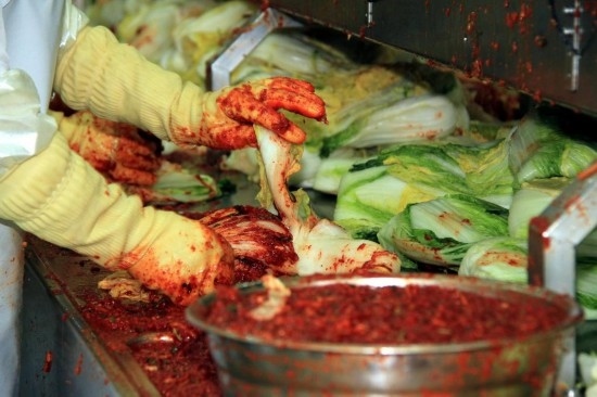 2011年12月8日,在韓國慶尚南道居昌郡韓國著名泡菜公司“宗家府”的工廠內(nèi),工人們將調(diào)制好的配料抹到整棵的大白菜上。新華社記者何璐璐攝