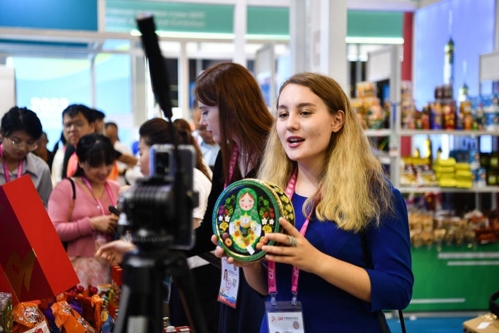 2023年9月19日,來(lái)自俄羅斯的參展商在中國(guó)陜西楊凌農(nóng)高會(huì)展臺(tái)進(jìn)行直播。新華社記者 張博文 攝