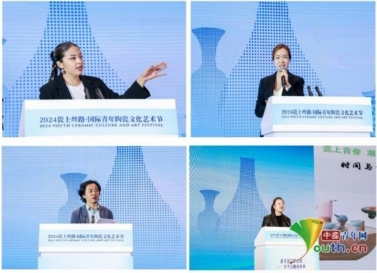 在主題演講環(huán)節(jié),四名陶瓷藝術(shù)領(lǐng)域青年藝術(shù)家代表分別上臺(tái)做了分享。土耳其青年藝術(shù)家佩琳因?qū)μ沾晌幕纳詈衽d趣而來到景德鎮(zhèn),她分享了自己對(duì)陶瓷文化的思考與理解,她認(rèn)為“陶瓷藝術(shù)飽含著人們對(duì)文化多樣性繁榮發(fā)展、美美與共的美好期許”。韓國青年藝術(shù)家宋耎姝以自己的作品《銀之?!窞槔?,和大家分享了創(chuàng)作感悟,她認(rèn)為“陶瓷藝術(shù)創(chuàng)作應(yīng)當(dāng)關(guān)注人與自然的和諧關(guān)系,從大自然中汲取養(yǎng)分”。第十二屆全國青聯(lián)委員、江西省青聯(lián)副主席、國家級(jí)技能大師工作室領(lǐng)辦人歐陽敏致力于陶瓷文化的傳播,他在分享中強(qiáng)調(diào),“陶瓷文化是中華文明與世界文明交流互鑒的橋梁和載體。各國青年應(yīng)當(dāng)做文化傳承創(chuàng)新的踐行者,充分挖掘各國歷史文化的獨(dú)特魅力和時(shí)代價(jià)值,把傳統(tǒng)文化與潮流文化融匯在陶瓷藝術(shù)的創(chuàng)作中,為共同推動(dòng)人類文明發(fā)展進(jìn)步貢獻(xiàn)青春力量。”景德鎮(zhèn)學(xué)院陶瓷美術(shù)與設(shè)計(jì)藝術(shù)學(xué)院院長張博以《陶瓷藝術(shù)在空間中的應(yīng)用》為題,分享了陶瓷文化所代表的中華傳統(tǒng)文化如何與當(dāng)代潮流文化相結(jié)合,共同繪制出一幅幅五彩斑斕的人類文明畫卷。