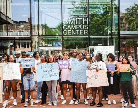 2023年7月1日,在美國馬薩諸塞州劍橋,人們手持標語在哈佛大學(xué)校園舉行游行,抗議美國聯(lián)邦最高法院做出的招生政策判決。新華社發(fā)(朱子于攝)