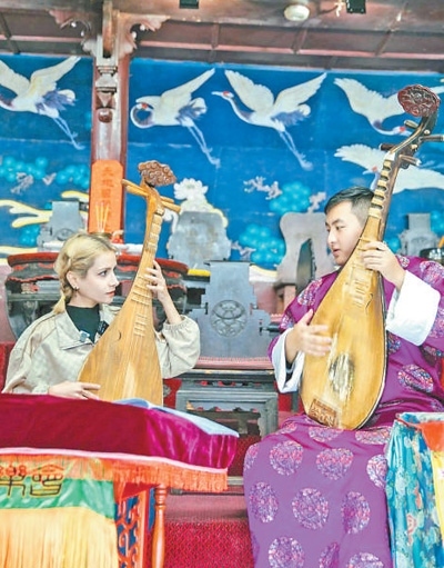 在一家漢服店,兩人興致勃勃地?fù)Q上漢服,特意選擇了紅色,“感覺(jué)一下子就融入了古鎮(zhèn)氛圍”。在公共閱讀空間“鐘書房”,他們?cè)诶蠋煹闹笇?dǎo)下,在紅紙上揮毫潑墨,學(xué)寫“福”字。喜歡爵士樂(lè)的他們隨身攜帶電吉他,看到有老師傅正在演奏二胡,便來(lái)到一旁即興合奏起來(lái),中西方音樂(lè)的交融,吸引許多游客駐足喝彩。“親眼來(lái)看看中國(guó),遠(yuǎn)比電視上看到的更美,以后還要帶著朋友再來(lái)。”他們的臉上透著興奮。
