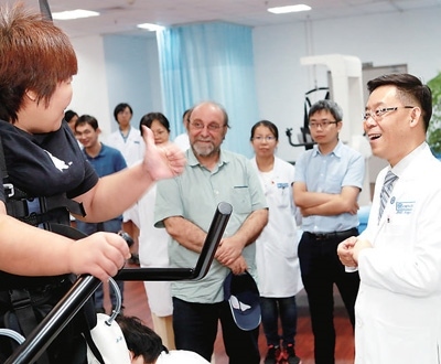 尼科萊利斯(中)與醫(yī)務(wù)人員共同指導(dǎo)截癱患者使用外骨骼康復(fù)機器人進(jìn)行步行訓(xùn)練。