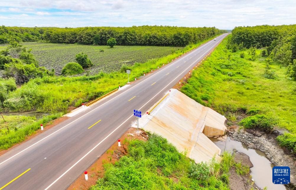 這是2024年7月14日在柬埔寨特本克蒙省拍攝的71C號(hào)國(guó)家公路(無(wú)人機(jī)照片)。新華社發(fā)(尼多拉攝)