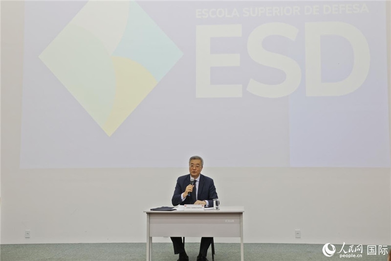中國駐阿爾及利亞大使董廣利(右一)、阿爾及爾第二大學(xué)校長拉赫曼尼(中)參加活動并致辭。人民網(wǎng)記者 郝瑞敏攝