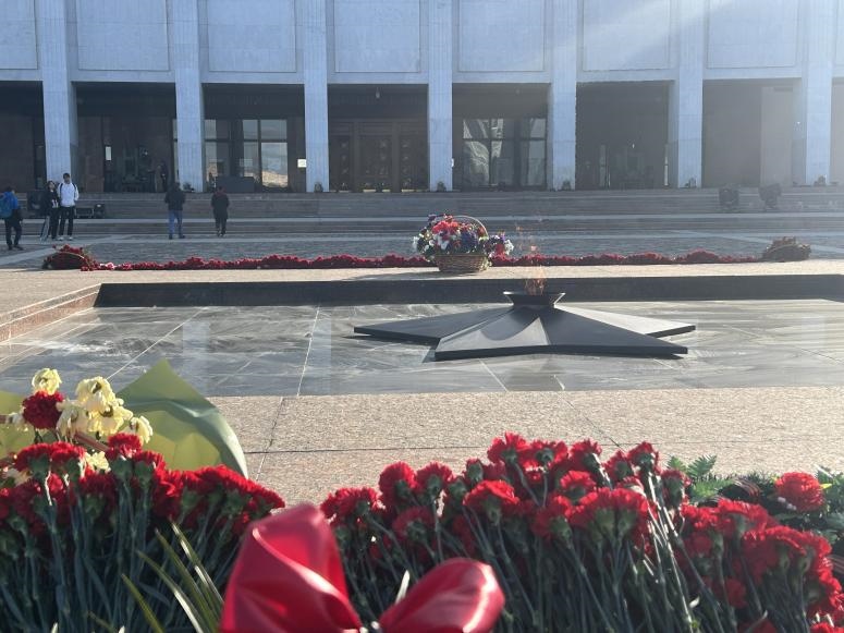 當?shù)貢r間5月6日下午,勝利廣場上的長明火兩側放滿鮮花。劉少華 攝