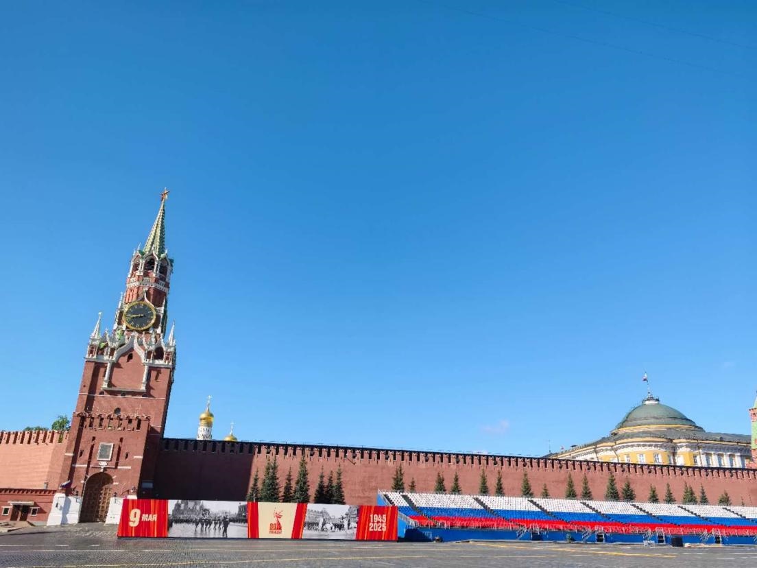 當?shù)貢r間5月6日,位于莫斯科紅場的圣瓦西里教堂前,已經(jīng)布置好了紀念蘇聯(lián)偉大衛(wèi)國戰(zhàn)爭勝利80周年慶典的展板。 劉少華、李建廣 攝