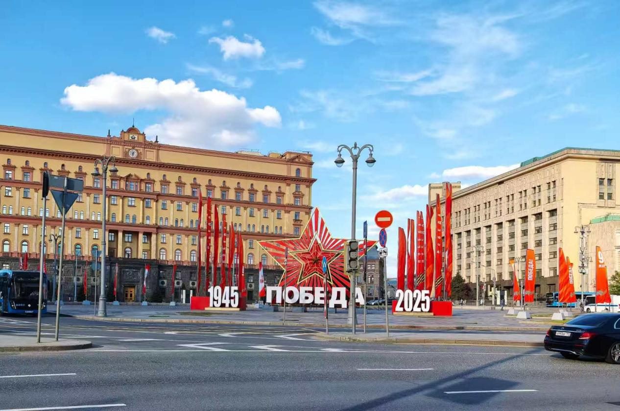 當?shù)貢r間5月6日,莫斯科盧比揚卡廣場布置紀念蘇聯(lián)偉大衛(wèi)國戰(zhàn)爭勝利80周年的標語。鄺西曦 攝
