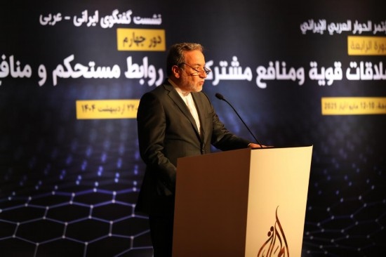 5月10日,伊朗外長阿拉格齊在卡塔爾多哈出席第四屆阿拉伯-伊朗對話會(huì)議時(shí)講話。新華社發(fā)(主辦方供圖)