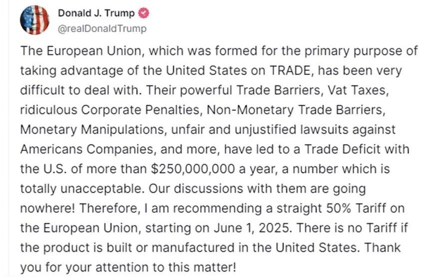 當(dāng)?shù)貢r(shí)間23日一早,美國(guó)總統(tǒng)特朗普在社交媒體上連發(fā)兩帖,矛頭分別對(duì)準(zhǔn)歐盟和蘋果。特朗普稱,歐盟“難打交道”“占美國(guó)便宜”,威脅自6月1日起對(duì)歐盟商品統(tǒng)一征收50%關(guān)稅;蘋果手機(jī)若不在美國(guó)生產(chǎn),應(yīng)面臨25%關(guān)稅。