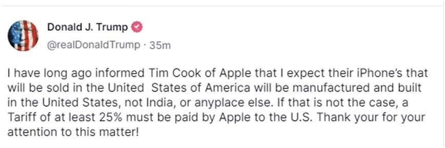 針對(duì)蘋果,特朗普說,他“很早之前就告訴過蘋果公司的(首席執(zhí)行官)蒂姆·庫(kù)克,我希望他們?cè)诿绹?guó)銷售的蘋果手機(jī)是在美國(guó)生產(chǎn)和制造,而不是在印度或者其他什么地方”,“如果不是這樣的話,蘋果公司必須向美國(guó)支付至少25%的關(guān)稅”。