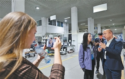 在物流分揀中心,聯(lián)合采訪團(tuán)隊正在進(jìn)行采訪。