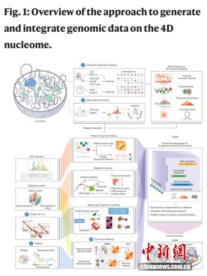 該論文介紹,人類染色體的三維組織結(jié)構(gòu),對于協(xié)調(diào)遺傳物質(zhì)調(diào)控生物反應(yīng)過程起到重要作用。DNA纏繞組蛋白形成名為染色質(zhì)的復(fù)合體,存儲在細(xì)胞核內(nèi)。大量染色質(zhì)位點(diǎn)可通過生物化學(xué)修飾來調(diào)控基因表達(dá)。繪制這一三維結(jié)構(gòu)及其如何經(jīng)時(第四維度)改變的工作,被稱為4D核組學(xué)。