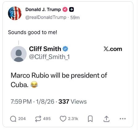 據(jù)報(bào)道,特朗普在其社交平臺(tái)“真實(shí)社交”(Truth Social)上回應(yīng)了一名用戶早些時(shí)候發(fā)布的一則帖文,內(nèi)容寫(xiě)道“魯比奧將成為古巴總統(tǒng)”。特朗普轉(zhuǎn)發(fā)時(shí)附上評(píng)論:“我覺(jué)得不錯(cuò)!”