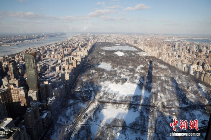 當?shù)貢r間1月29日,從100層高樓俯瞰冰雪封凍的紐約市,中央公園白雪皚皚,遠處的哈德遜河布滿浮冰。中新社記者 廖攀 攝