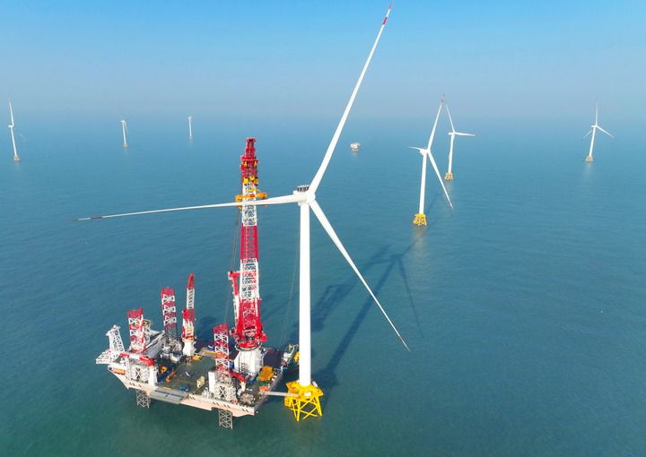 2026年1月13日在福建閩南海域拍攝的“大橋海風”號2000噸自升式海上風電安裝平臺和20兆瓦風電機組吊裝現場(無人機照片)。新華社記者 林善傳 攝
