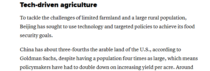 美國消費者新聞與商業(yè)頻道援引高盛集團的數據報道稱,中國擁有的耕地面積約為美國的四分之三,但人口是美國的四倍之多,這意味著中國的政策制定者必須加倍努力提高每畝土地的產量。