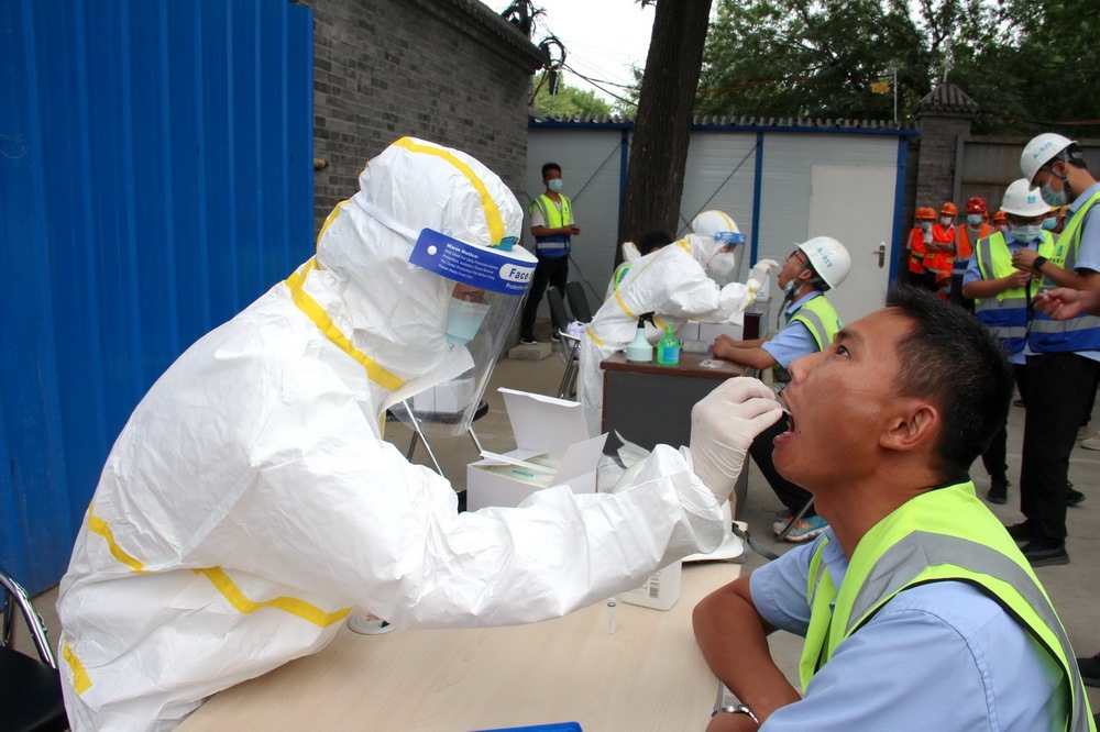 6月15日至17日,中建三局北京公司在京1042名職工做完核酸檢測,同時公司邀請專業(yè)機構(gòu)為在建項目的上萬名勞務(wù)工人、安保及物業(yè)管理人員提供上門核酸檢測。新華社發(fā)(柯玉乾攝)