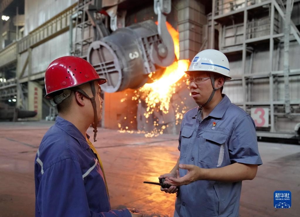 邯寶煉鋼廠特檔技術(shù)主管、轉(zhuǎn)爐車間副主任唐笑宇(右)在轉(zhuǎn)爐車間與工友交流(2022年9月7日攝)。新華社記者 楊世堯 攝
