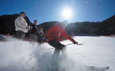 黑崖溝村開設(shè)了高山滑雪場(chǎng),教練為孩子們示范滑雪動(dòng)作。