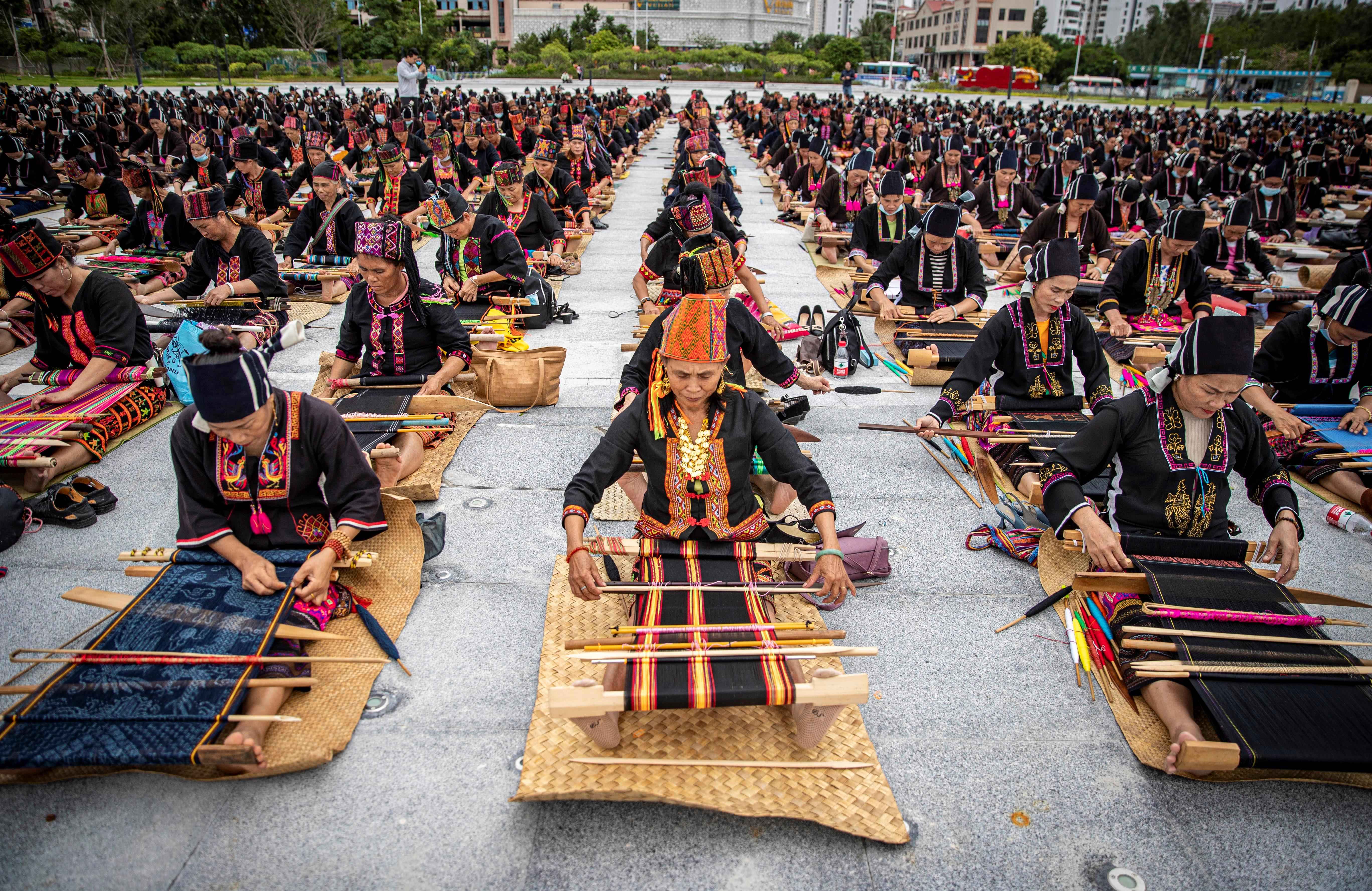 △2021年10月16日,海南東方文化廣場(chǎng),千名身著傳統(tǒng)服裝的黎族婦女熟練織黎錦。
