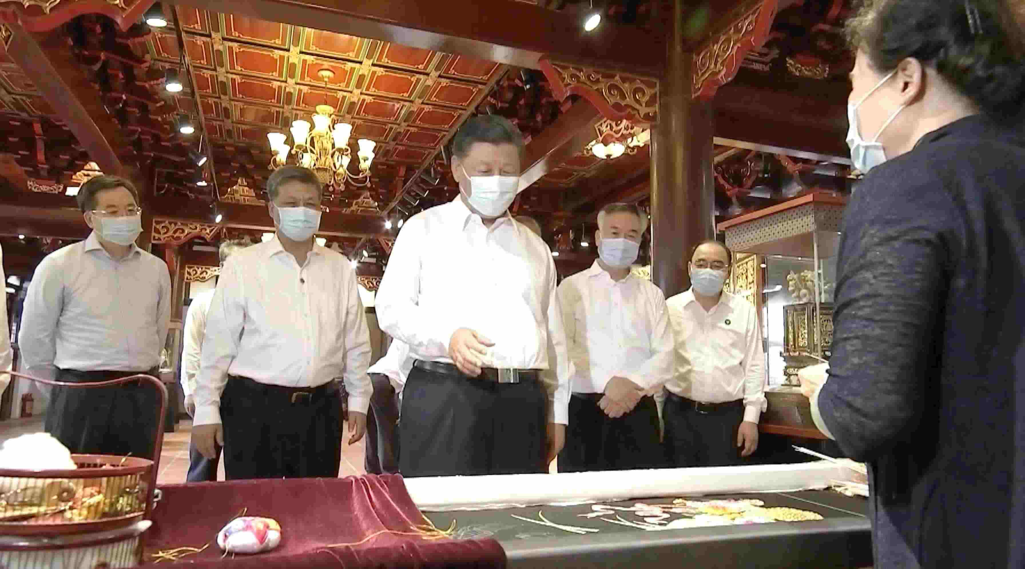 在潮州,總書記叮囑,要加強(qiáng)非物質(zhì)文化遺產(chǎn)保護(hù)和傳承,積極培養(yǎng)傳承人,讓非物質(zhì)文化遺產(chǎn)綻放出更加迷人的光彩;在四川成都戰(zhàn)旗村,總書記察看蜀錦、蜀繡等手工藝品展示,還買下一雙手工制作的唐昌布鞋;在江蘇徐州馬莊村的香包制作室,總書記對(duì)非遺傳承人王秀英制作的香包贊不絕口……