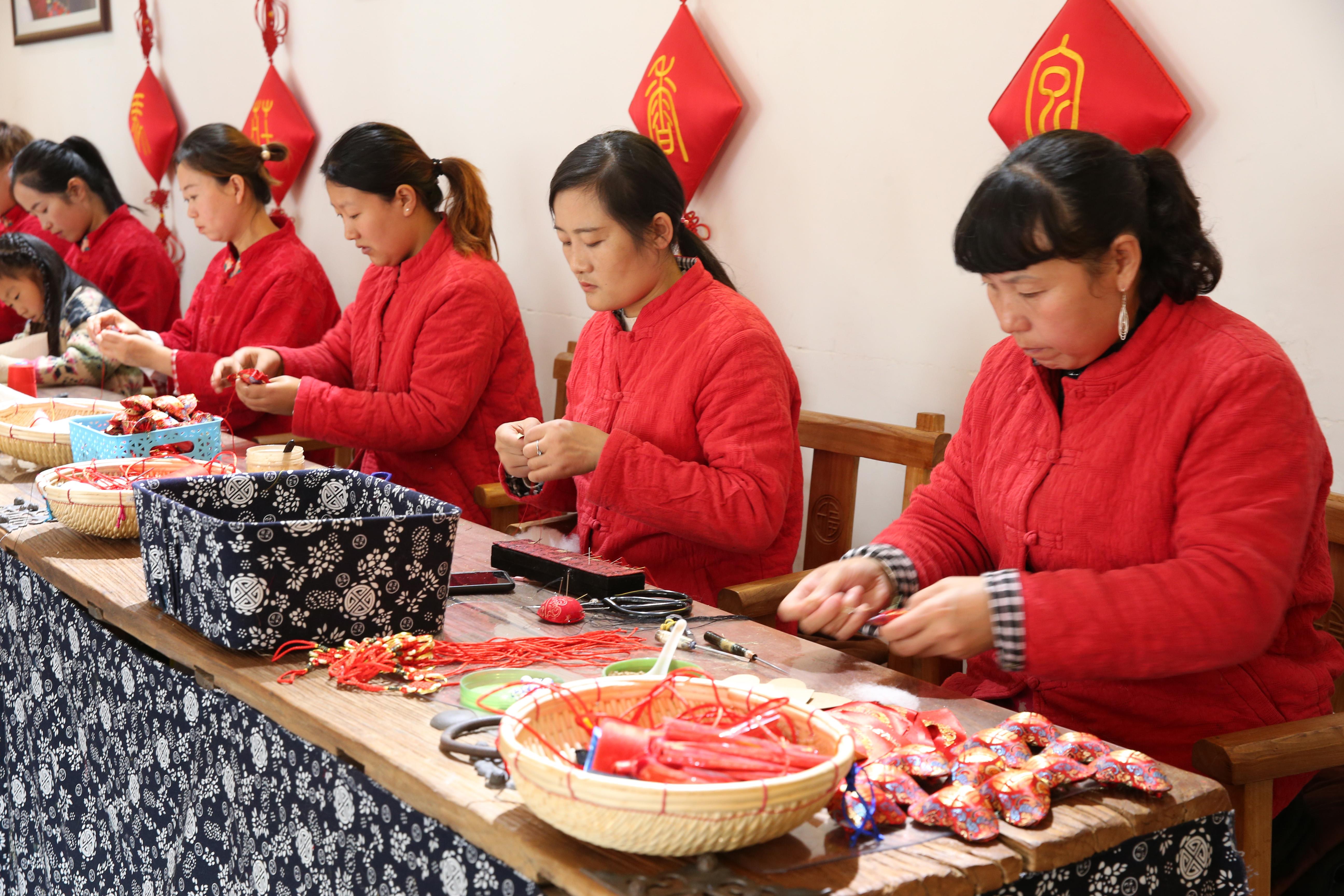 △在化屋村扶貧車間,隨處可見(jiàn)村民忙碌的身影。車間里有服裝刺繡、工藝品、蠟染等產(chǎn)品,銷量良好。