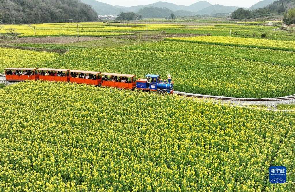 游客在江西省婺源縣嚴(yán)田景區(qū)乘坐“小火車(chē)”觀(guān)賞花海(3月3日攝,無(wú)人機(jī)照片)。