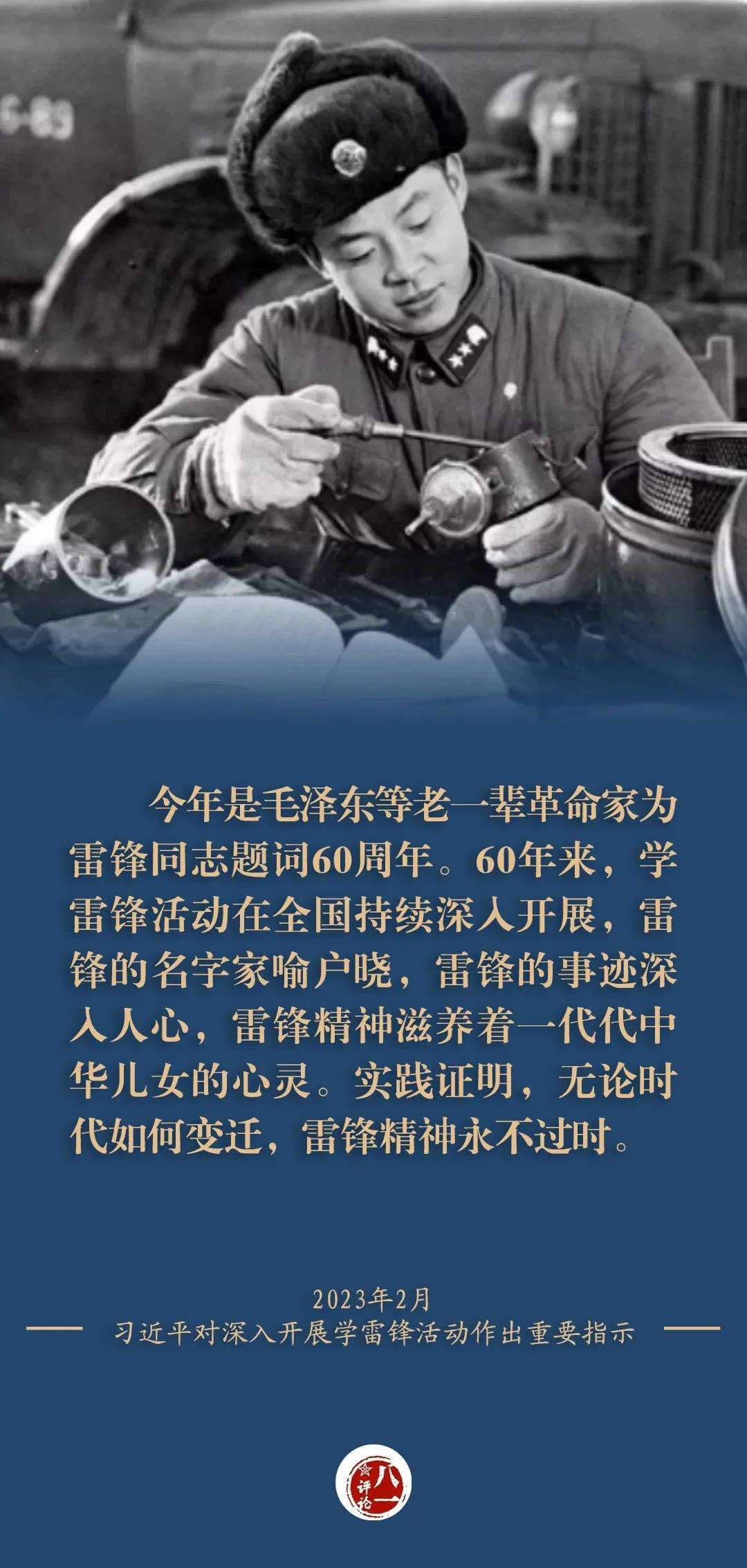 60年前,毛澤東同志題詞“向雷鋒同志學(xué)習(xí)”,從此雷鋒的名字響徹神州大地、傳遍大江南北,雷鋒精神廣為傳揚(yáng)、深入人心。