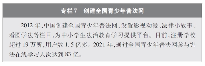 加強青少年網(wǎng)絡法治宣傳教育。青少年是祖國的未來、民族的希望。青少年網(wǎng)民在中國網(wǎng)民中的占比逐步增長。作為互聯(lián)網(wǎng)的“原住民”,青少年是網(wǎng)上學習、交流、生活最活躍的參與者、實踐者,其合法權益也更易受到網(wǎng)絡違法活動的侵害。中國從保護青少年網(wǎng)絡權益,促進青少年健康成長、全面發(fā)展出發(fā),遵循青少年身心發(fā)展規(guī)律,貼近青少年學習生活實際,聚焦網(wǎng)絡沉迷、網(wǎng)絡欺凌、網(wǎng)絡淫穢色情信息等重點問題,通過普法微綜藝、兒童普法話劇、網(wǎng)絡普法故事廣播、網(wǎng)絡普法云課堂、學法用法知識競賽、法治副校長進校園、編寫網(wǎng)絡普法讀本等生動活潑、豐富多彩的形式開展法治宣傳教育,逐步形成了政府、社會、學校、家庭相結合的法治宣傳教育格局,為提升青少年網(wǎng)民法治意識和網(wǎng)絡安全素養(yǎng)提供了全面保障。