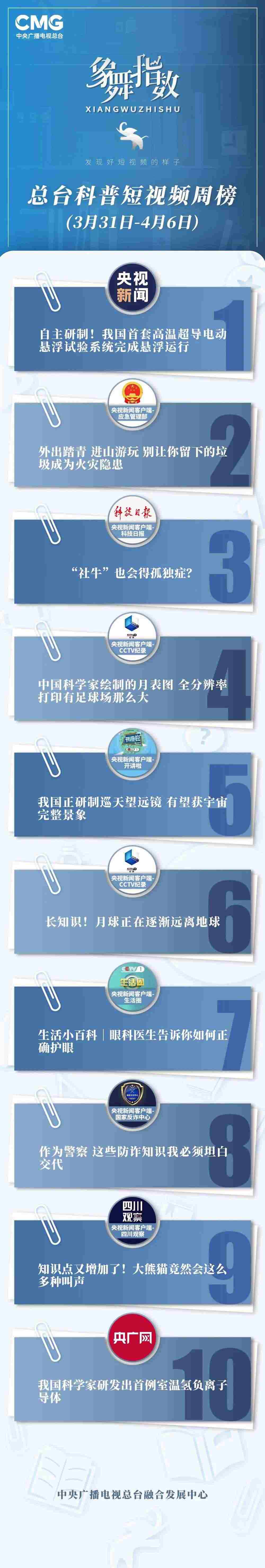 中央廣播電視總臺(tái)“象舞指數(shù)”評(píng)議品牌,推出科普短視頻周榜、總臺(tái)科普短視頻周榜。在2023年3月31日-4月6日,值得注目的內(nèi)容有:
