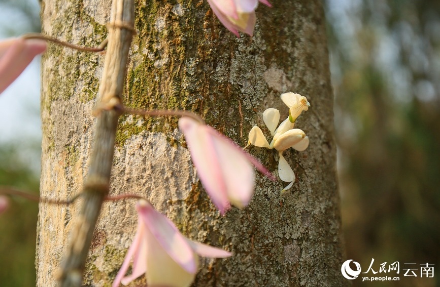 周會蘭介紹,4月12日早上,她吃過早飯后來到自家附近的山上采摘可食用的白花,在一條箐溝旁的樹林陡坡處,她采摘了一些白花后,轉(zhuǎn)身開始撿拾落在草叢中的白花。“突然,一朵白色的花引起了我的注意,當(dāng)我伸手去撿時,這朵花竟然自己挪了個位置?!敝軙m說,當(dāng)時覺得很奇怪,花還會自己動,慢慢才發(fā)現(xiàn)是一只蟲子。