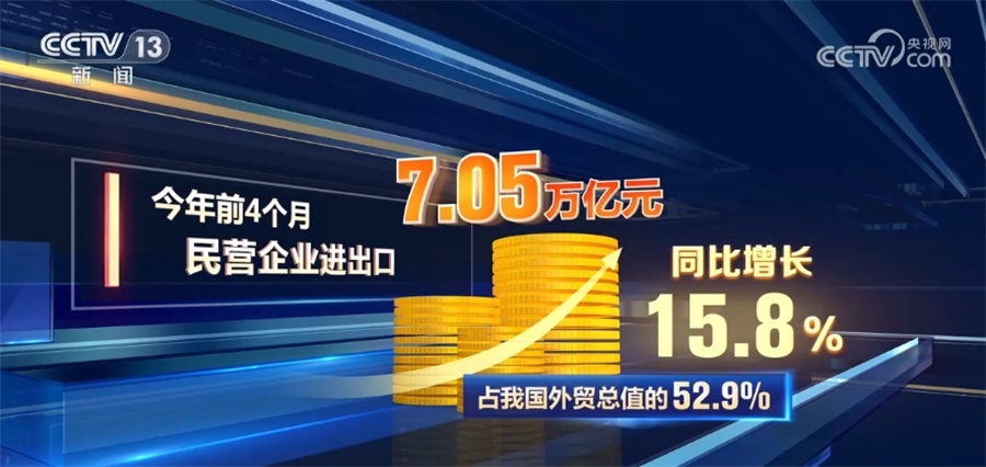 海關(guān)統(tǒng)計(jì)顯示,今年前4個(gè)月,民營(yíng)企業(yè)進(jìn)出口7.05萬(wàn)億元,同比增長(zhǎng)15.8%,占我國(guó)外貿(mào)總值的52.9%。