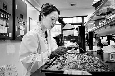 3月29日,在內蒙古林業(yè)科學研究院承擔的“沙地生物資源保護與培育國家林業(yè)和草原局重點實驗室”,科研人員在觀察黑果枸杞組培苗的培養(yǎng)狀態(tài)。丁根厚攝/光明圖片
