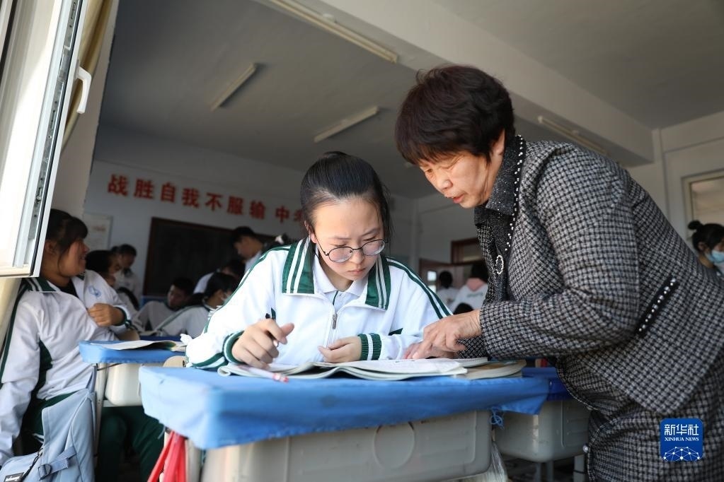 英語(yǔ)老師在課間輔導(dǎo)李昕偉(5月8日攝)。