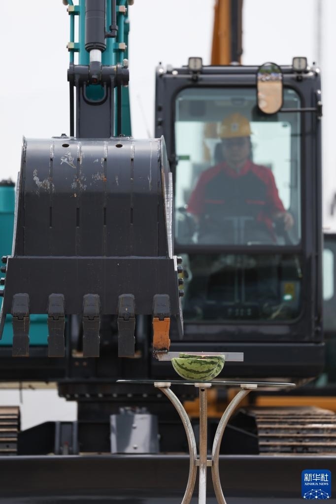 5月13日,在長沙國際工程機(jī)械展覽會上,機(jī)手駕駛挖掘機(jī)切西瓜。