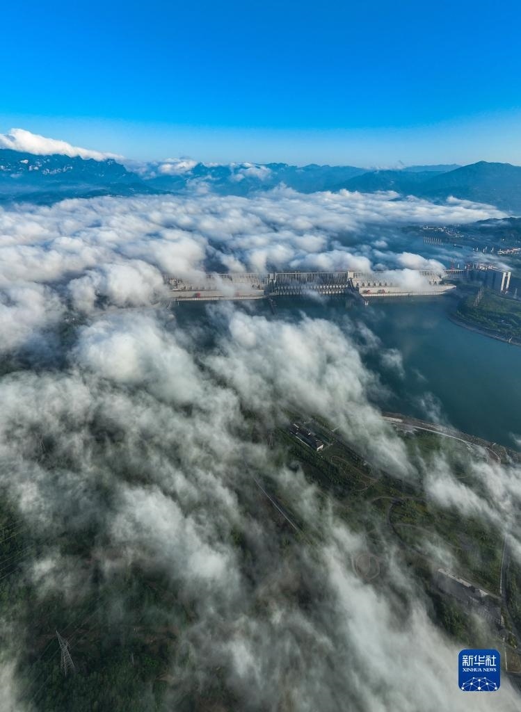 當(dāng)日,湖北宜昌雨過天晴,三峽上空云霧繚繞,美景如畫。