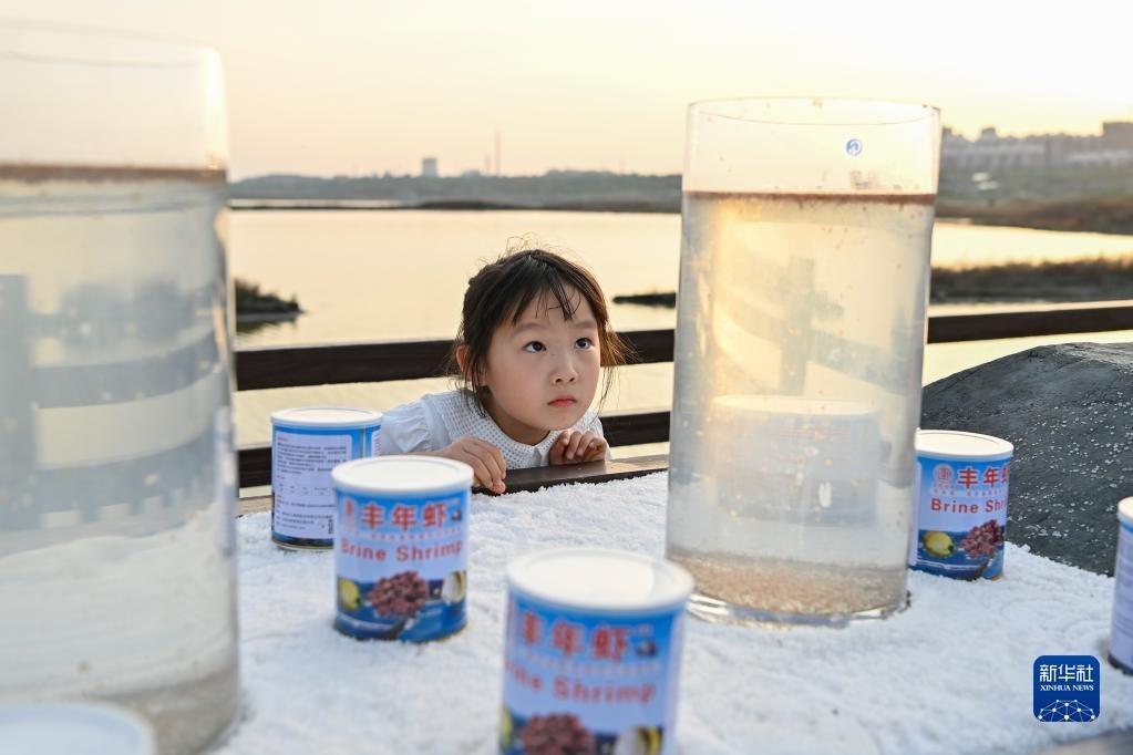 5月16日,小朋友在運城鹽湖觀察展出的鹵蟲。