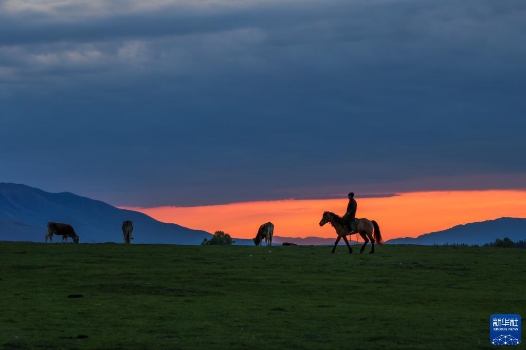 5月20日,夕陽下的那拉提草原上,牧民騎馬牧歸。