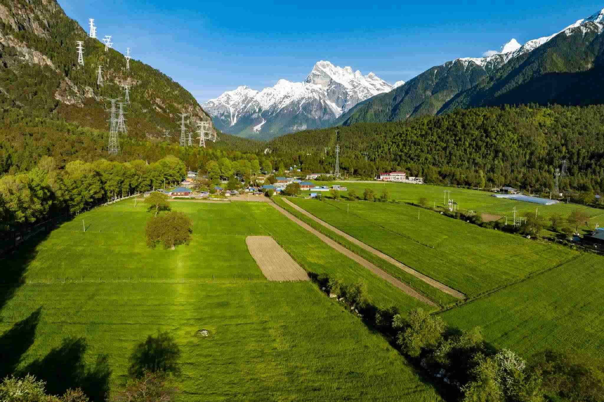 西藏林芝:村莊樹木茂密 遠(yuǎn)處雪山巍峨