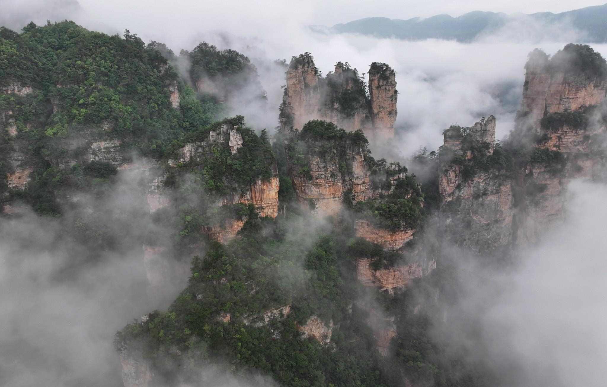 2023年5月27日,湖南張家界,國家森林公園天子山、十里畫廊出現(xiàn)雨后云海勝景,云霧在峰林間變幻飄逸,宛如水墨畫境。視覺中國