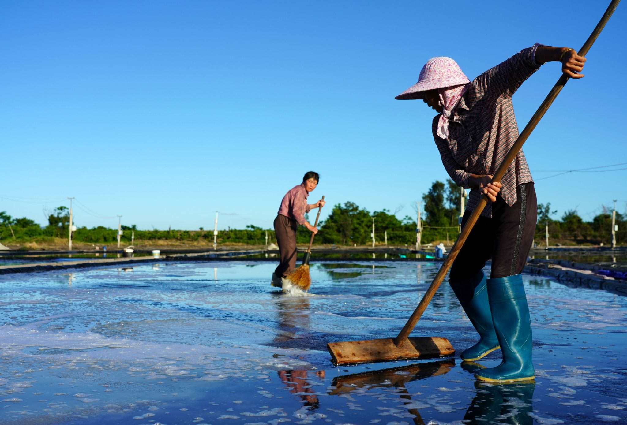 2023年5月29日,浙江溫州,在樂清市南塘鎮(zhèn)山馬曬鹽場,鹽民在鹽田里收鹽。視覺中國