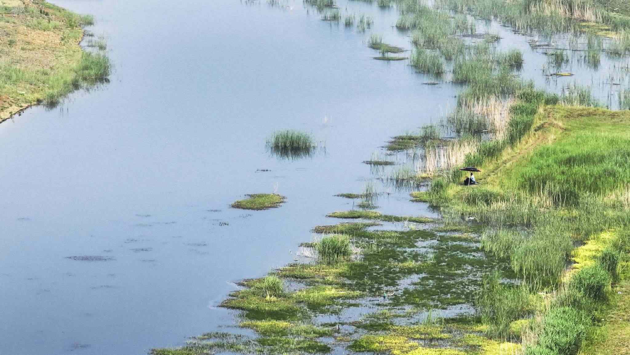 2023年5月31日,山東棗莊,薛城區(qū)蟠龍河國(guó)家濕地公園綠意盎然、流水潺潺、水鳥(niǎo)翩躚而至,繪就一幅美麗的生態(tài)畫(huà)卷。視覺(jué)中國(guó)