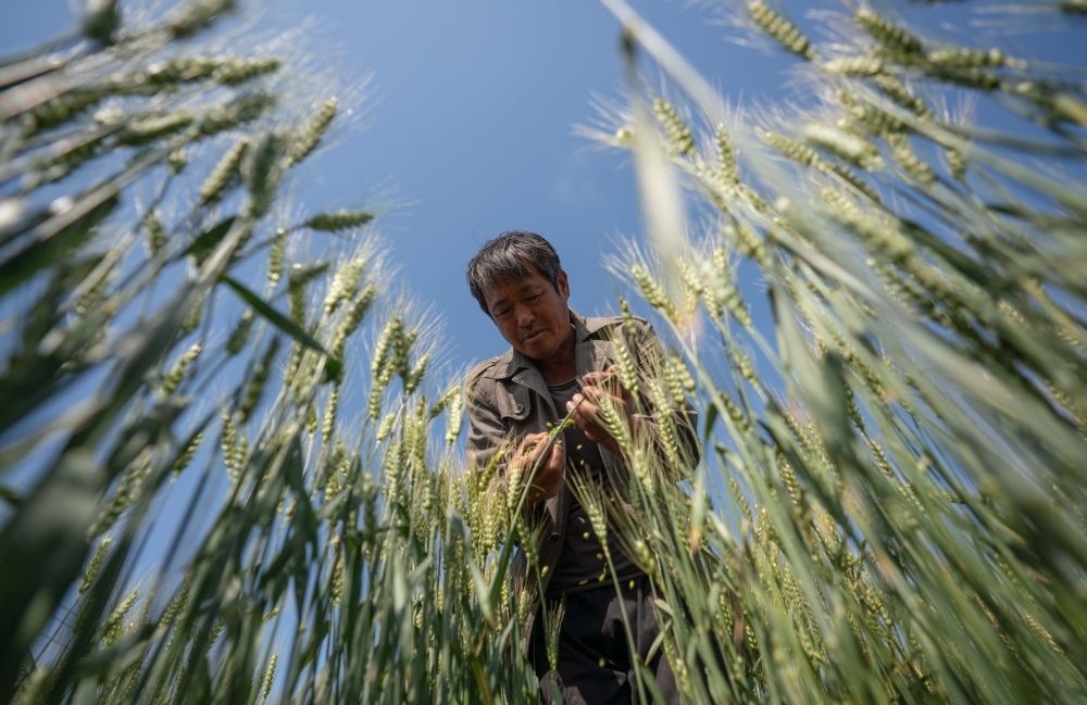 5月19日,在山東省東營(yíng)市黃河三角洲農(nóng)業(yè)高新技術(shù)產(chǎn)業(yè)示范區(qū),農(nóng)科人員在觀察“濟(jì)麥60”的生長(zhǎng)情況。新華社記者 徐速繪 攝