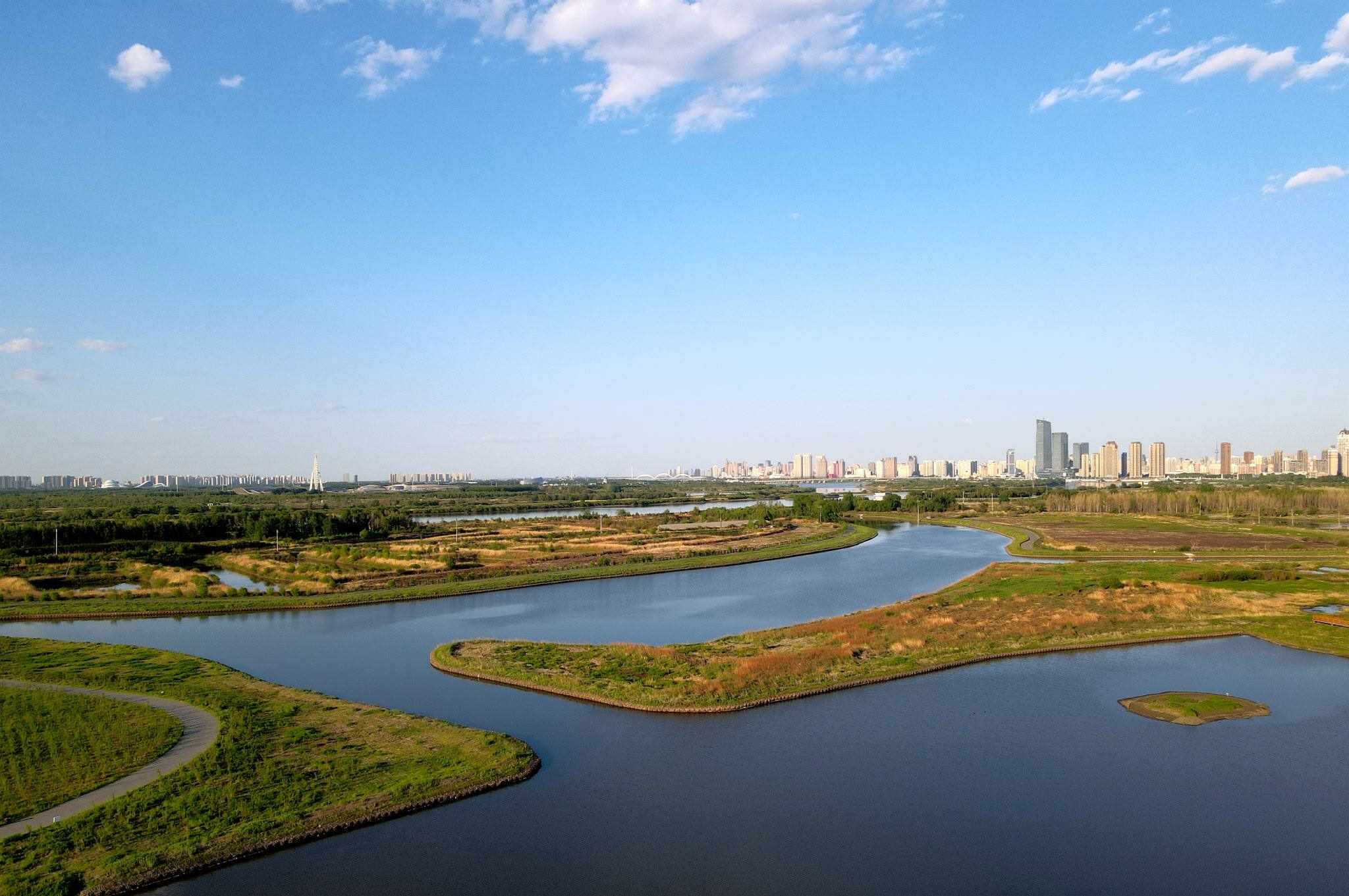 2023年5月30日,哈爾濱,松花江畔,外灘濕地中,“靴子”小島草木茂盛,綠意盎然。視覺(jué)中國(guó)