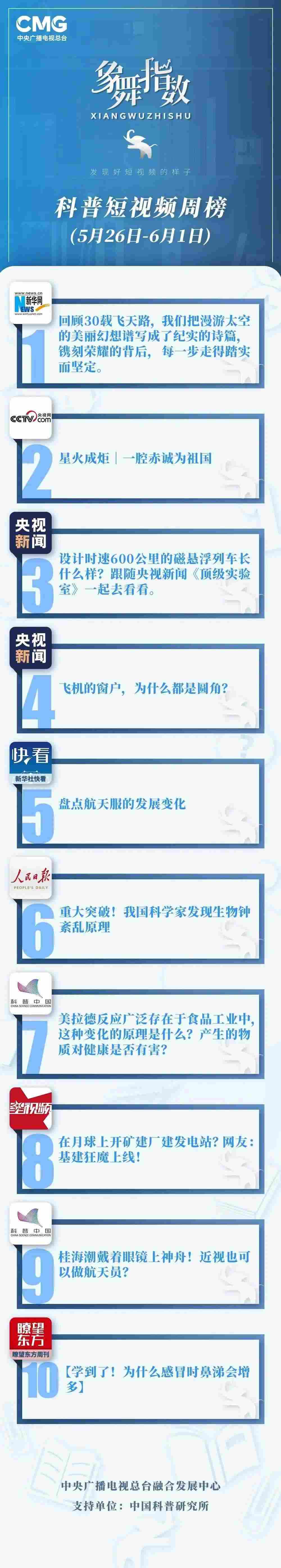 中央廣播電視總臺“象舞指數(shù)”評議品牌,推出科普短視頻周榜、總臺科普短視頻周榜。在2023年5月26日-6月1日,值得注目的內(nèi)容有: