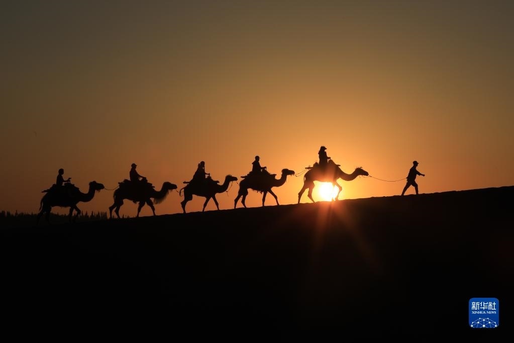 6月7日清晨,在甘肅敦煌鳴沙山月牙泉景區(qū),游客騎乘駱駝感受大漠風光。