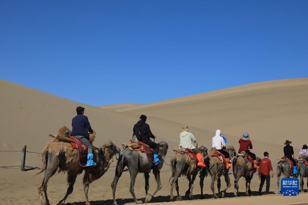 6月7日,在甘肅敦煌鳴沙山月牙泉景區(qū),游客騎乘駱駝感受大漠風光。