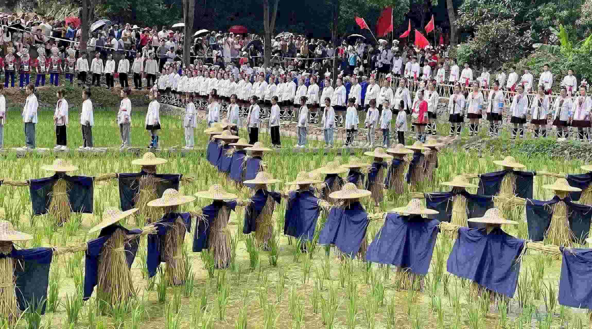 2023年6月10日,侗族同胞在貴州省黎平縣肇興侗寨田園實景展示侗族大歌。