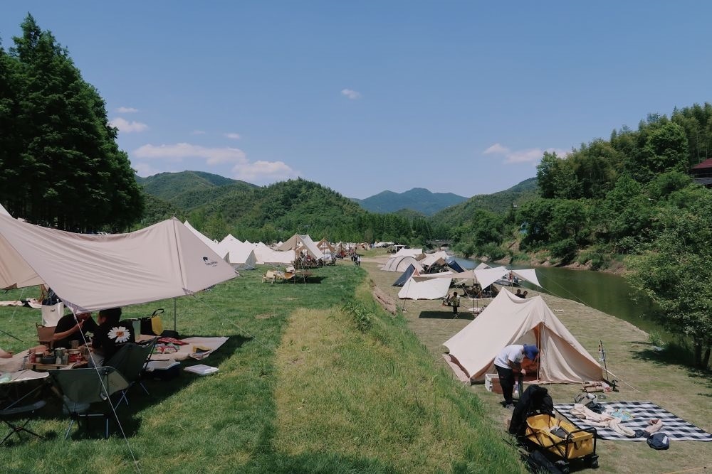 人們?cè)诤菔邪布h“小杭坑”營地休閑(2022年5月3日攝)。新華社記者 鄭夢(mèng)雨 攝