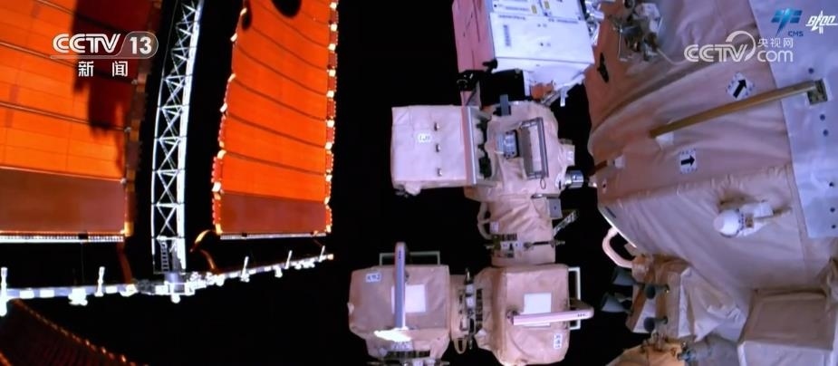 這是3位航天員正在夢天實(shí)驗(yàn)艙進(jìn)行空間輻射生物學(xué)暴露實(shí)驗(yàn)裝置出艙工作,航天員將載荷安裝到載荷轉(zhuǎn)移機(jī)構(gòu)。載荷出艙前,航天員在反復(fù)仔細(xì)檢查,隨后,關(guān)閉夢天實(shí)驗(yàn)艙貨物氣閘艙艙門。通過該裝置開展空間粒子輻射等環(huán)境要素,對樣本材料生物學(xué)效應(yīng)的研究,為科學(xué)實(shí)驗(yàn)生物樣品提供生命保障。